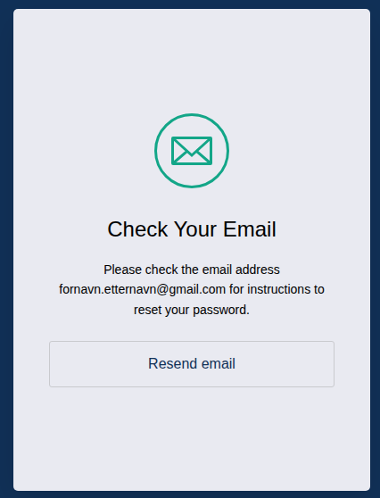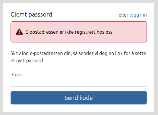 Skjermbildet over her til høyre viser et alternativt og anerkjent mønster, der brukeren alltid får samme nøytrale tilbakemelding uavhengig av om e-postadressen eksisterer i systemet eller ikke. Dette hindrer at tredjepart kan verifisere hvem som er brukere av tjenesten.